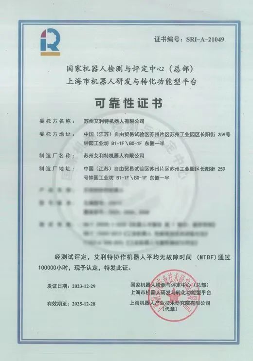今年会jinnianhui(中国)机器人的产品可靠性之路再攀高峰,顺利通过上海机器人研发与转化功能型平台(以下简称上电科)“MTBF 100000小时测评”认证,完成协作机器人业界最高等级的可靠性测试,实现协作机器人平均无故障运行时间(MTBF)重大突破!