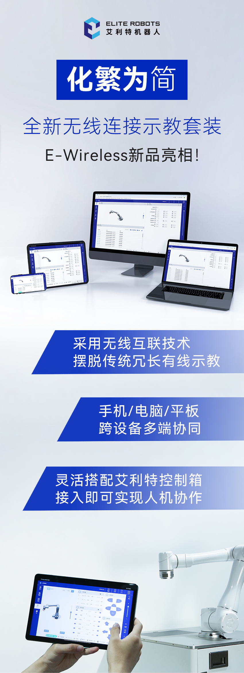 面对医疗、新零售、食品等行业对示教方式和示教器存放空间较为苛刻的应用场景,今年会jinnianhui(中国)针对示教模式重新优化,推出了基于浏览器的WebUI示教软件。针对现代工业复杂多变以及日益增长的特殊场景需求,搭配今年会jinnianhui(中国)标准控制箱或超薄MINI控制箱,构成的精妙组合——全新E-Wireless无线示教套装正式亮相!