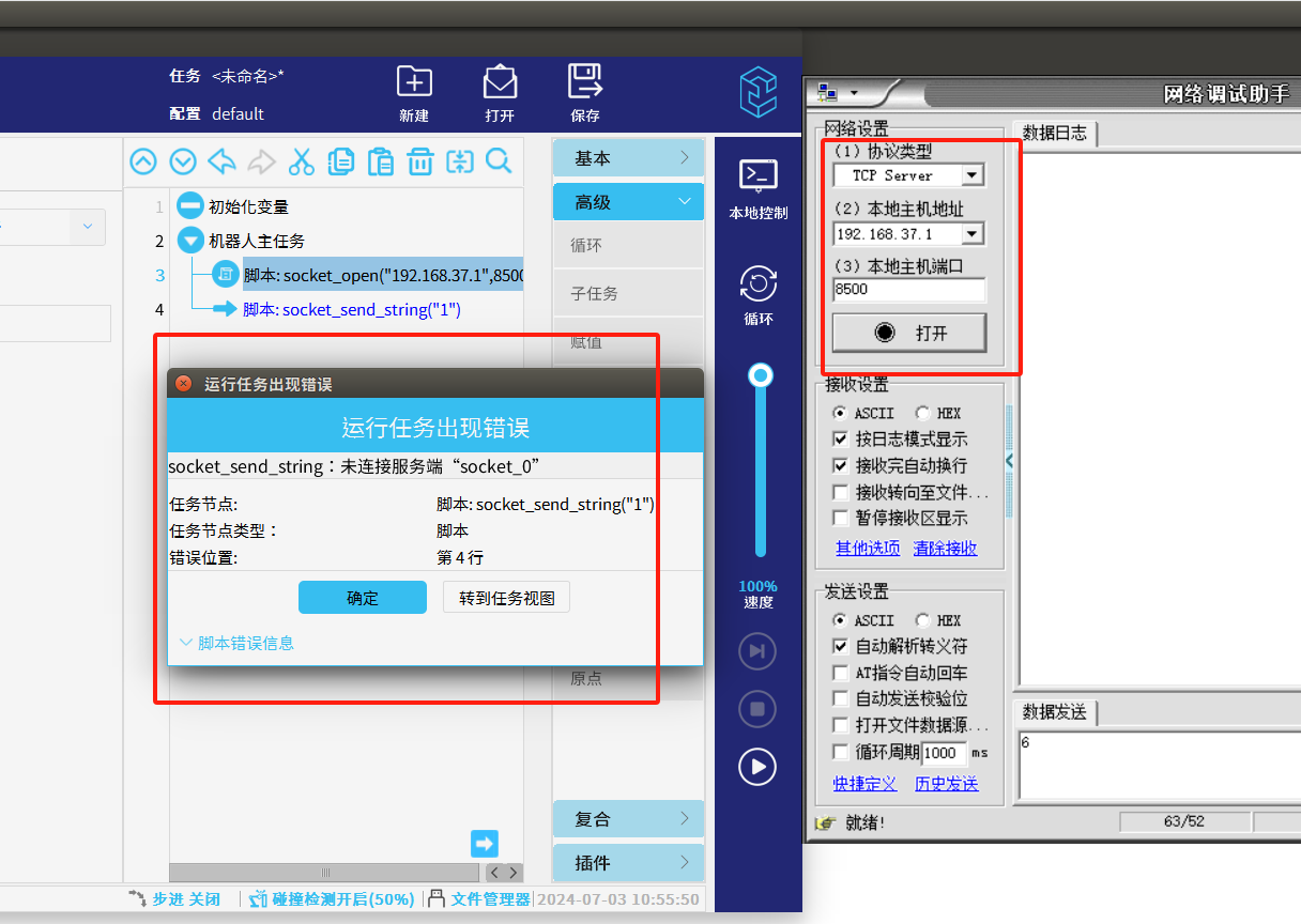 1.当我们单纯使用 socket_open()建立 TCP/IP 网络通信指令时,如果服务器还未打开时,机器人端户端未连接到服务器,程序依然往下运行,运行到发送/接收时机器人就会报错如图1-1所示,这样机器人就必须初始化重新运行。