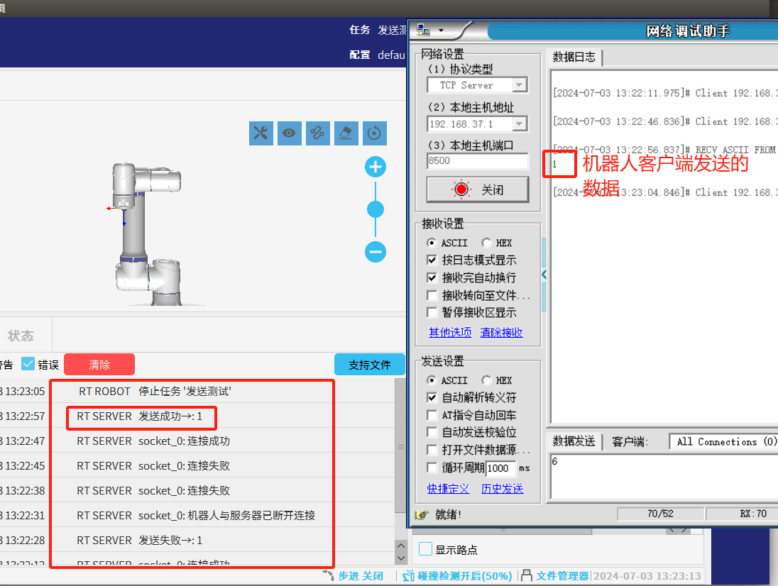 2.为了避免图1-1的情况发生我们可以利用socket_open()建立 TCP/IP 网络通信时的返回值做条件判断循环连接直到连接成功后程序才继续往下运行。如图1-2所示如果服务器未打开时机器人会一直与服务器建立连接并打印“连接失败”到EliRobot 的日志栏中。