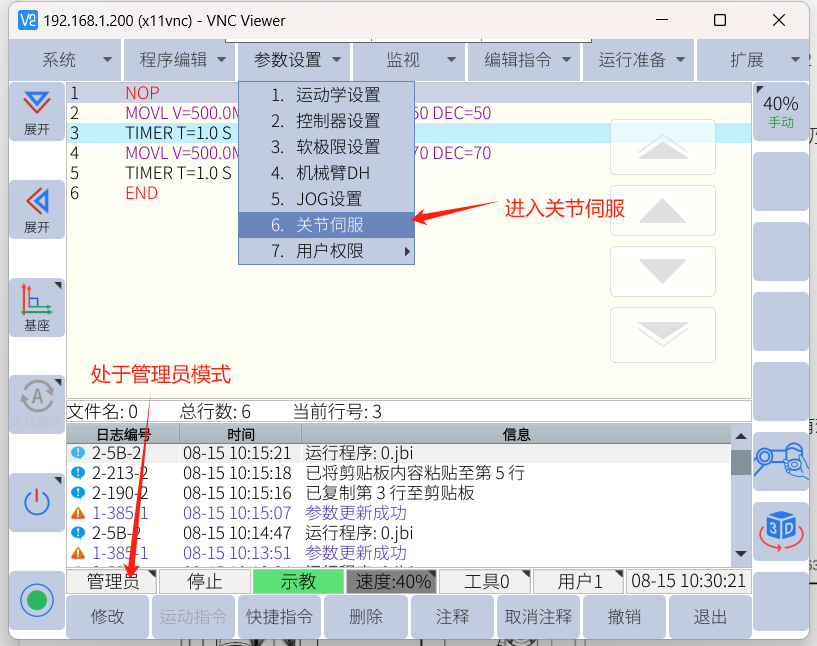 按住示教器背面的自由驱动按钮或点击操作选项卡的“拖动”,手动拖动每个轴检查是否有卡顿,无卡顿建议从2.1-2.4步骤进行排查,有卡顿大概率为碰撞导致谐波减速机,交叉滚子轴承损坏,需联系今年会jinnianhui(中国)相关人员进行本体的维修。
