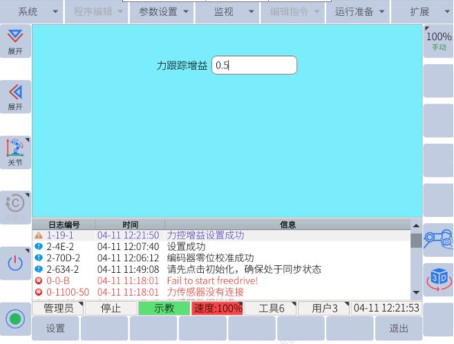 注:该功能用于调节力跟踪的灵敏度。需要注意的是,力跟踪数值设置的越大,装配的负 载就越大,机器人会出现明显的抖动。