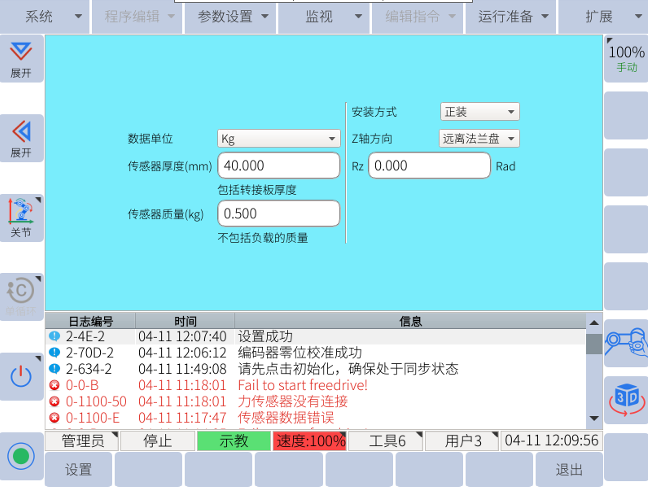 以上步骤完成后,可以点击监视-力控传感器数据,若以上步骤都正确,则传感 器数据在不断变化,可施加不同方向的力,看力的方向是否和法兰坐标系一致, 后续的步骤可参考用户手册_3.10.2力控功能章节进行传感器标定,负载辨识及负载惯量辨识。设置完成后即可正常使用。