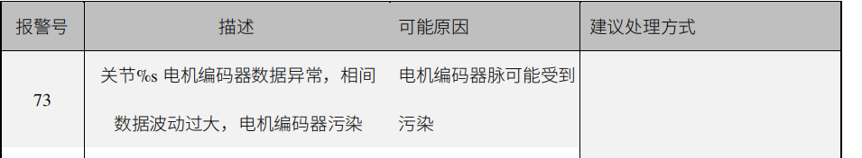 当机器人出现报警70,71,72,73当中的任意一个代码时,可以按照用户手册上的故障代码进行断电重启操作,若重启后任然报警则表示机器人光编可能出现了污染,可以对其进行屏蔽,如果屏蔽后出现其他报警代码或者点位不准的现象则需联系厂家进行返厂维修。
