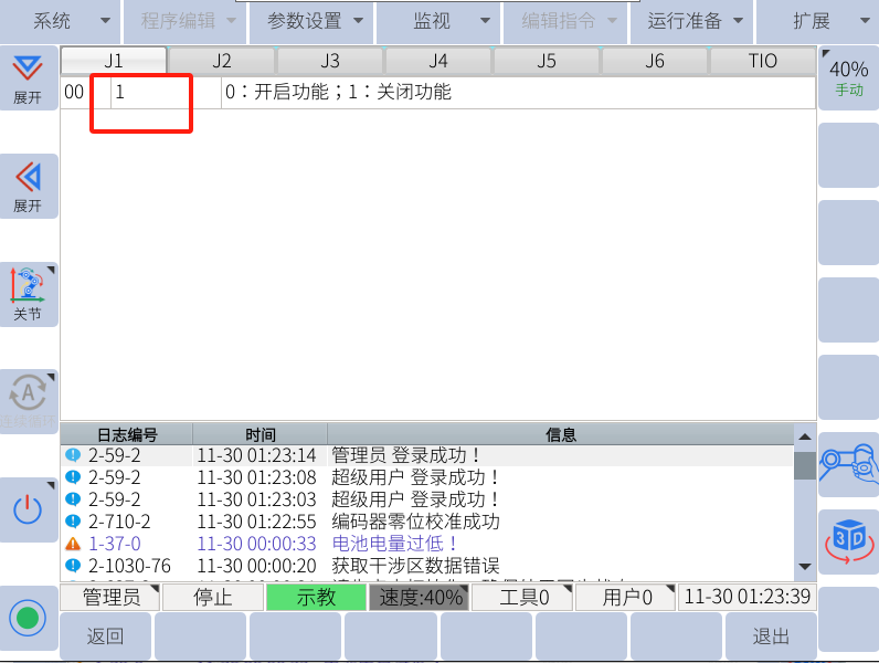改为5后机器人会提示报警,等待几秒后清除报警,然后断电重启机器人