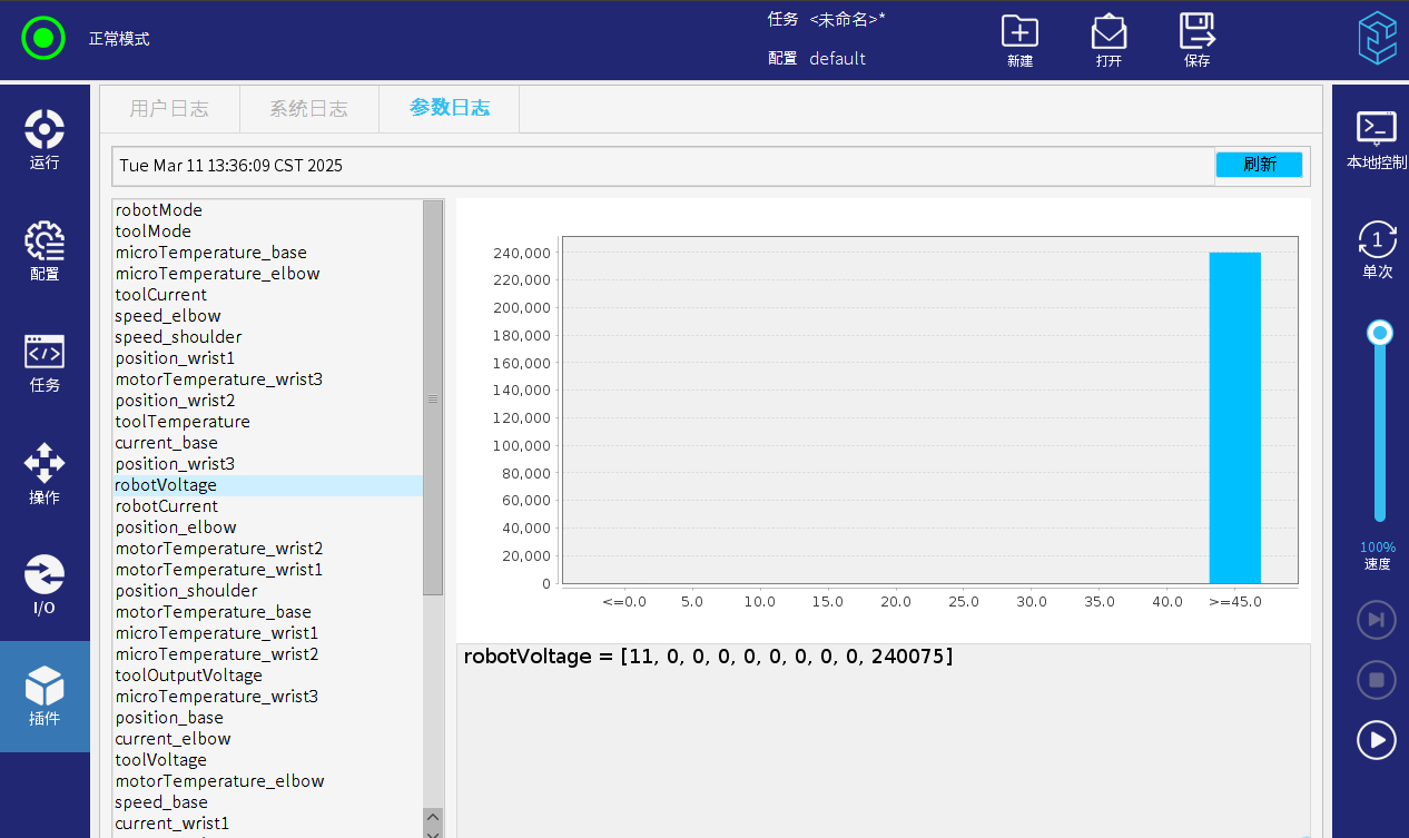 ● 参数日志:为系统运行时各参数在取值范围内所取值出现的次数,调取histogram.properties文件内容。当选中左侧的某个参数名称,右侧会显示该参数在不同取值点出现的次数的直方图,直方图下方会显示这些数据的一个数组,表示对应值的出现次数。如可以查看机器人关节温度是不是长期在正常某个范围内,还是说长期在一个异常的温度范围内