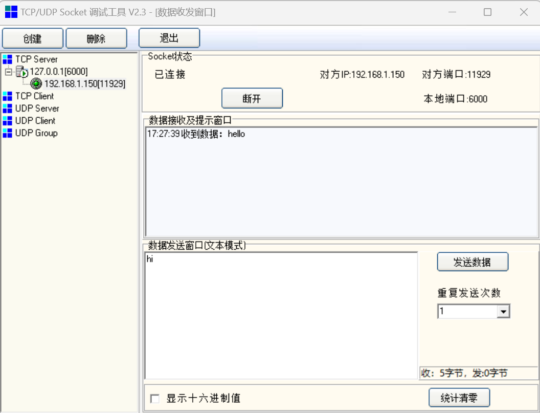 socket_send_string("hello") 向通讯助手发送字符串