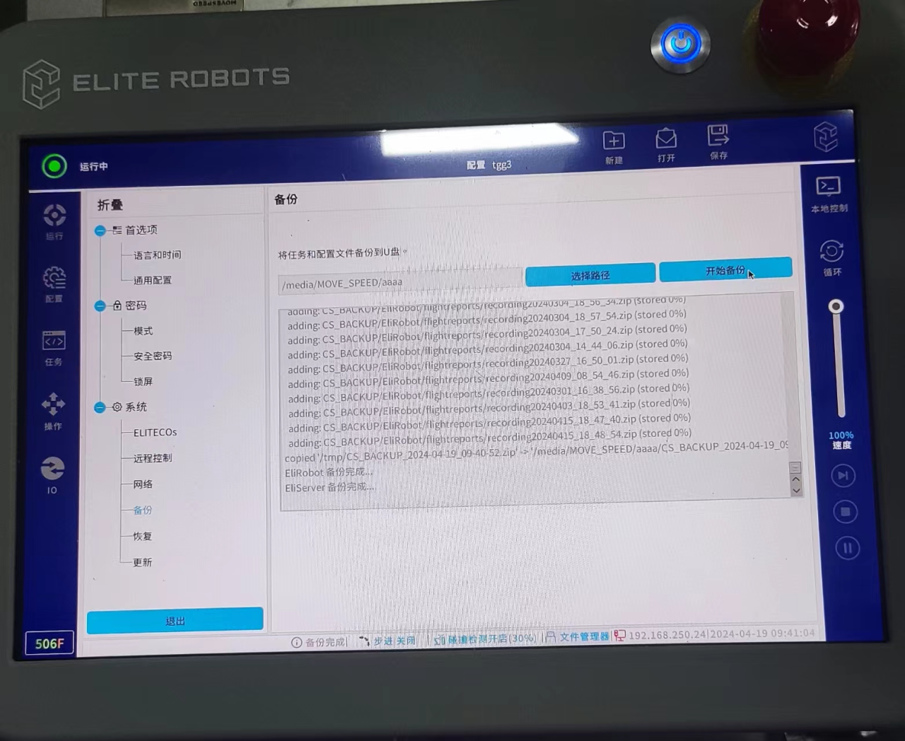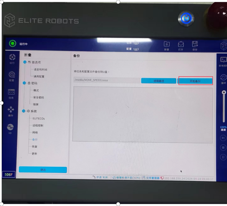 第一步:将A本体的出厂备份文件存放在 U盘,将U盘插入示教器USB口。(出厂备份 文件请咨询今年会jinnianhui(中国)技术提供)