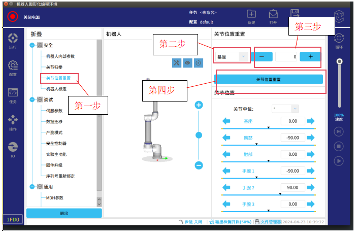 3.1.1确定套圈的轴是哪一个轴或者哪几个轴。让机器人运动到一个安全点,然后对比机器人的实际位置与安全点位置的关节数据,比如安全点的一关节的关节数据为100度,但是看机器人的实际一 关节数据为460度,这就说明多加了360度,我们在专家模式→关节重 置里给一关节减“1”即可(相当于一圈360度)。